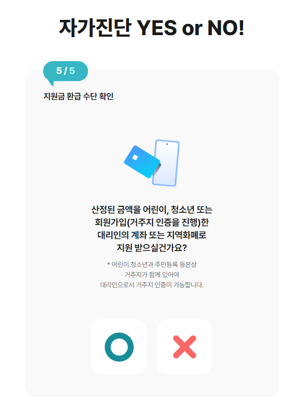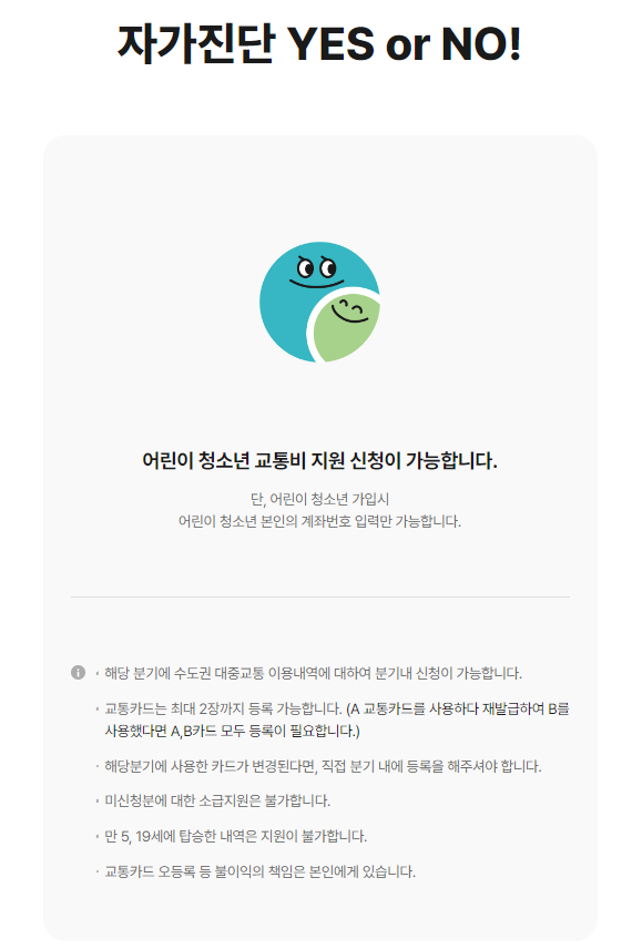 어린이 같은 경우, 대린인인 부모님께서 회원가입을 진행해 주시면 되고, 교통카드 등록 시에 해당 카드 확인하시고 교통카드번호 등록 후 지역화폐 또는 은행계좌를 등록해주시면 자동신청 완료 됩니다.