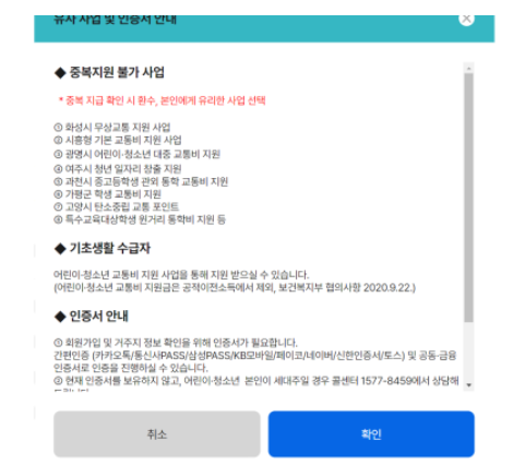회원가입하시다보면 중간에 중복지원불가사업과 선/후불 교통카드 번호 확인안내등 자세히 설명되어 있으니 천천히 회원가입 진행해주시면 쉽습니다 ^^