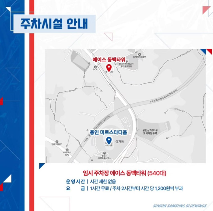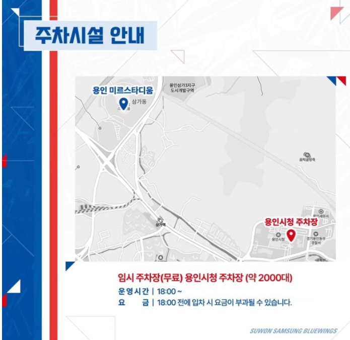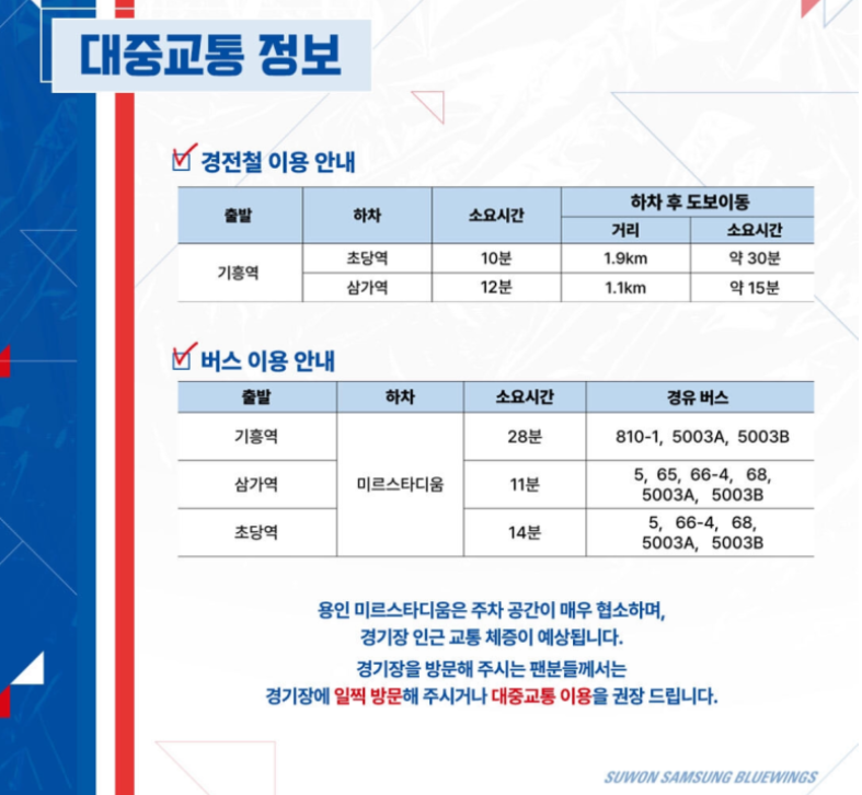 용인미르스타디움은 주차공간이 매우 협소합니다. 가능하시다면 반드시 대중교통을 이용하시길 바랍니다. 아래 수원삼성블루윙즈에서 정보를 가져와 봤으니, 참고해 보시는 것도 좋겠습니다.